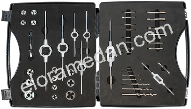 - Consisting of hand taps (2 steps), tap wrench, countersink, circular dies, die holder, guideways and thread gauge