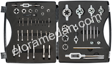 - Consisting of hand taps (2 steps), tap wrench, countersink, circular dies, die holder, guideways and thread gauge